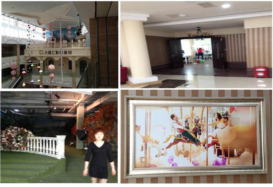 Um cenário que me pareceu a Floresta do Chapeuzinho Vermelho (!?!?); o que conseguimos fotografar de um estudio interno; a Chinesa que resolveu tomar conta de nós; e finalmente uma foto finalizada e com muito photoshop, com certeza (estava pendurada ao lado de um estúdio).