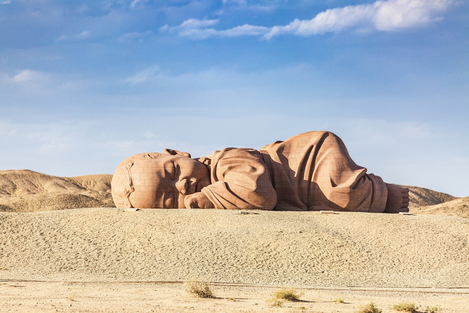 - No Deserto de Gobi, mais exatamente na província de Gansu, é onde ficam as enormes esculturas a céu aberto, incluindo um bebe gigante dormindo nas areias do deserto. O nome da escultura é “Filho da Terra”, foi inaugurada em 2016 e possui 15 metros de comprimento, 9 de largura e a altura de 4,3 metros, impressiona qualquer pessoa, mesmo em fotos.